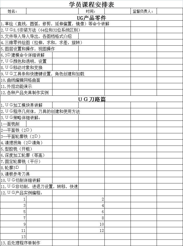 UG軟件應(yīng)用,2D、3D畫圖,加工前的避讓修復(fù)與補(bǔ)孔,加工工藝分析,2D、3D刀路,制作程序單、定制加工模板等,整組模具的UG數(shù)控編程加工流程安排及實(shí)訓(xùn) |